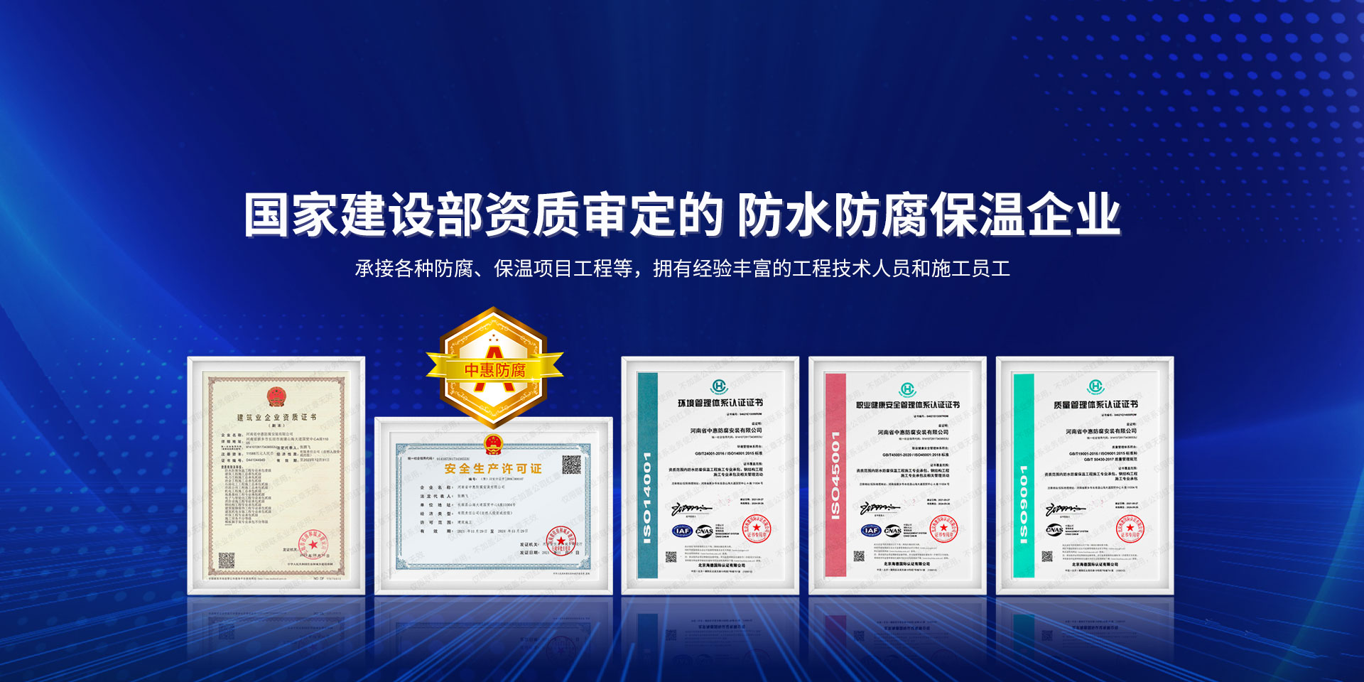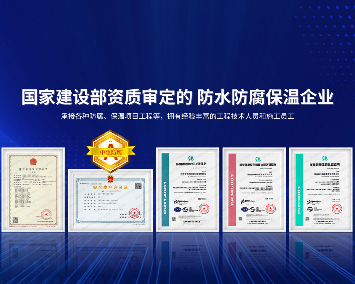 公司經營范圍:防水防腐保溫工程;消防設施工程;建筑裝修裝飾工程;建筑機電安裝工程;電力工程;建筑工程;石油化工工程;工業清洗工程;油罐清洗工程;鋼結構工程;環保工程;模板腳手架工程;電纜防火封堵、防污閃噴涂、外墻外保溫工程;各類施工勞務作業;設備維修、船舶鉚焊、涂裝;電力工程材料、建材、防水材料、防火材料、防腐保溫材料銷售,并相繼通過了GB/T19001-2008idtISO9001:2008GB/T50430-2007質量管理體系認證證書。GB/T24001-2004idtISO14001:2004環境管理體系認證證書。GB/T28001-2011idtOHSAS18001:2007職業健康安全管理體系認證證書。公司是中國防腐蝕于防護協會、中國施工企業管理協會、電力協會和中國鋼結構防水協會會員單位。 公司的經營業務涵蓋了石油、化工、電力、冶金、煤炭、船舶、國防、燃氣、水利、環保、交通運輸、航空及國防軍工和輕紡市政等行業的防腐保溫絕熱設備。鋼結構安裝、防火、防水、金屬噴鍍、聚脲噴繪、陰極保護、防滲透堵漏、玻璃鋼及各種磚版材料襯里、橡膠襯里、煙氣硫和耐酸溶劑腐蝕等工程施工。公司連續十年榮獲“省市先進施工企業”“安全生產先進單位”“重合同,守信用企業”和“AA***資質企業”的稱號。2000年被命名為市級文明單位,2002年被國家工商行政管理局命名為“重合同,守信用的企業”、被中國工業防腐蝕技術協會命名為“防腐蝕企業,能源節約及環境保護領域有豐富的經驗和***的業績。工程一次交驗合格率100%。其中攀枝花鋼鐵公司煉鐵廠四號高爐及熱風爐防腐工程、上海寶鋼公司煤氣柜防腐工程、撫順石油一廠裝置防腐項目、齊魯石化公司稀烴廠高塔防腐工程、吉林化學工業公司煉油廠油罐防腐工程、天津石化熱電廠六號爐頂棚聯絡管保溫工程、大慶油田(太倉)力神泵業工程、中國化學工程第十一建設工程、中原油田勘探局工程、中國石化銷售有限公司華北分部、魯皖輸油管道工程、貴州開磷息烽合成氨工程、陜西黃陵煤化工程、中國石油天然氣西部管道塔里木輸油工程、邯鋼集團邯寶鋼鐵公司煉鐵工程、德州供電工程、吉寶(南通)船廠工程,偃師華潤熱力工程、鄭州熱力總公司。 河南省中惠防腐安裝有限公司愿以豐富的施工經驗,***的技術,***的設備,***的管理,***的服務,竭誠為國內外廣大的用戶提供***滿意、******的工程作品。 我公司愿與國內外同仁一道,團結協作,共同推進防腐蝕行業發展! 公司地址:河南省長垣縣建設路北段360號 固定電話:0373-8866488 郵編:453400 網址:http://www_zhff_com_cn.jygawx.com